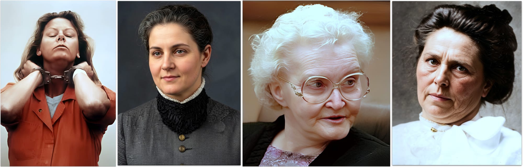 Female serial killers present distinct profiles but the same moral logic: Aileen Wuornos (PCL-R 32) killed seven men in claimed self-defense that escalated into robbery; Jane Toppan’s sadistic poisoning of patients as a nurse; Dorothea Puente’s exploitation and murder of vulnerable tenants for financial gain; and Belle Gunness’s profit-driven elimination of husbands and suitors all involved instrumental choice despite abusive histories or manipulative facades.